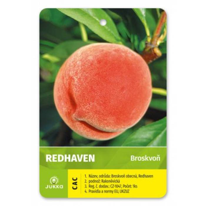 Broskvoň Redhaven je kříženec odrůd Halehaven a Kalhaven. Není náročná na stanoviště, ale vyžaduje půdy dobře zásobené živinami a vláhou. Plody jsou nažloutlé a z převážné části pokryté výrazným červeným líčkem. Dužina broskvoně Redhaven je žlutá, okolo pecky načervenalá, dobré chuti, jemně aromatická, od pecky odlučitelná až u zcela zralých plodů. Dozrává asi v půlce srpna. Podle této odrůdy se určuje zralost ostatních odrůd. Redhaven má vysokou odolnost proti mrazíkům, střední odolnost proti napadení kadeřavostí.