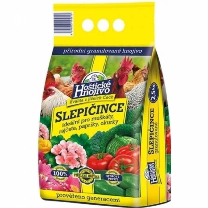 přírodní produkt obsahující fermentovaný slepičí trus. Pro vysoký obsah fosforu je po staletí využíván při pěstováni okrasných rostlin, ale i ovoce a zeleniny. Příznivě působí na bohatou násadu květů a při pěstování ovoce a zeleniny přináší velkou úrodu. Hoštické Hnojivo slepičince je určeno k širokému užiti jak v zahradě, tak i při pěstování okrasných rostlin v truhlících a v jiných nádobách. Rovněž je vhodné k základnímu vyhnojeni půdy buď na jaře, nebo při její podzimní přípravě. Hnojivo se aplikuje na povrch zeminy rozhozem a pak se mírně zapraví do půdy (ručním rytím, zahrabáním apod.) a dostatečně zavlaží. Složení: 7 % N + 13 % P2O5 + 2 % K20.
