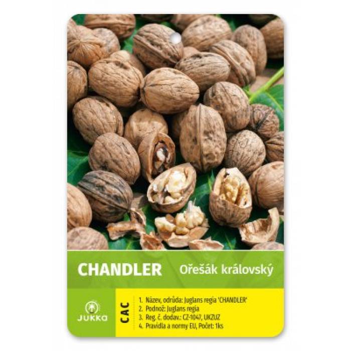 Nová oblíbená americká odrůda ořešáku, plodí na laterárních (bočních) pupenech, má tedy vyšší výnosy o 50-70 % oproti jiným odrůdám. Strom roste bujně, korunu tvoří kulovitou. Ořešák Chandler později nakvétá, dobře tedy odolává jarním mrazíkům. Plody jsou velmi velké polopapíráky s tenkou žlutohnědou zvrásnělou skořápkou, dozrávají v polovině října. Jádro je bílé barvy, bez hořkosti, velmi dobré chuti, vyplňuje asi 55 % plodu.